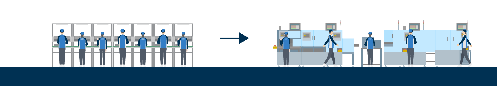 Previously, Matsusaka’s blood pressure monitor production line required human operators to be assigned to each process. A low-cost intelligent automation (LCIA) system was deployed to replace this manned line with automated machines, matching operators and machines for maximum effectiveness. This led to increasing those processes having more efficient interaction between machines to reduce tasks that were manually performed before.
