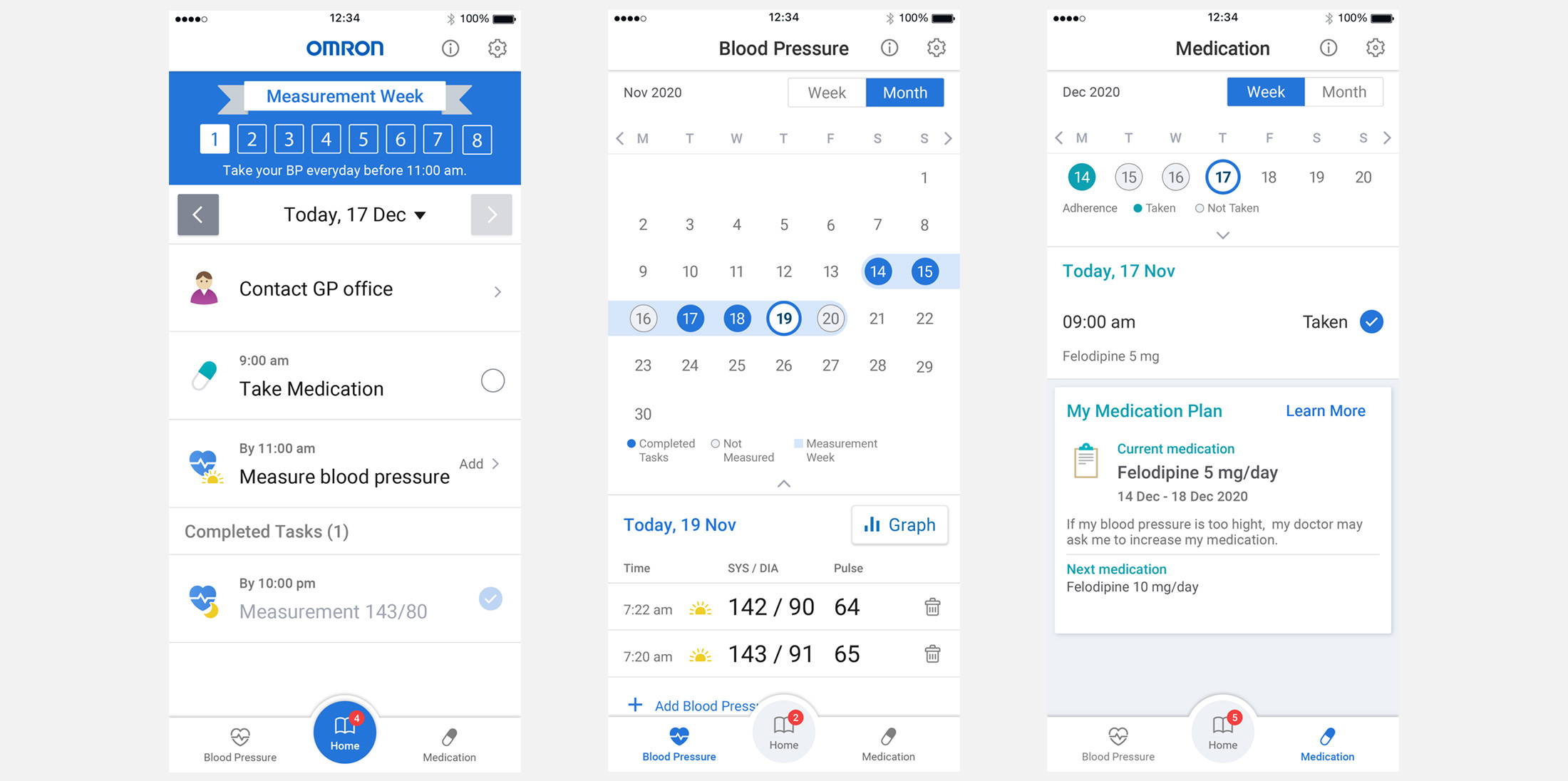 Smarthphone app screen for patients / Left: Daily BP management schedule containing the time of day for medication and measuring BP / Center: BP management screen showing BP readings and graph / Right: Medication plan screen showing the previous medication plan and medication status