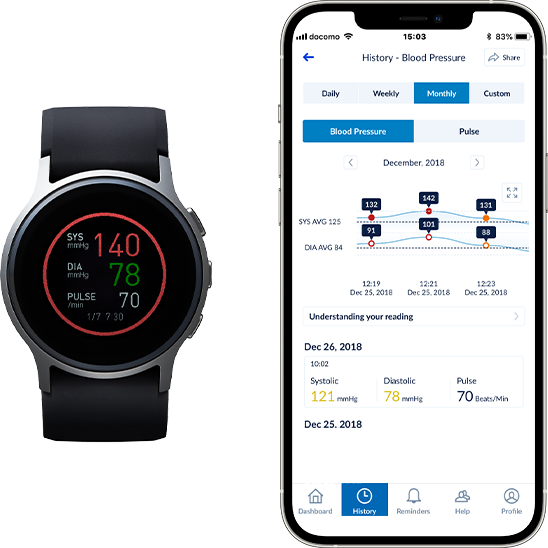 Watch-sized wearable blood pressure monitor. Monitor blood pressure whenever and wherever. The measurement results can be confirmed on HeartAdviser, the smartphone app.