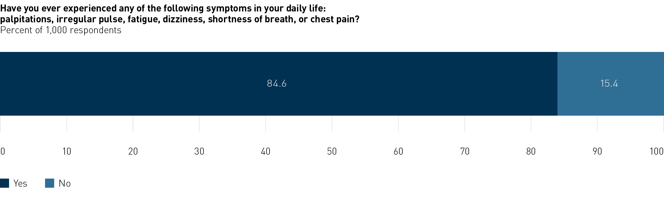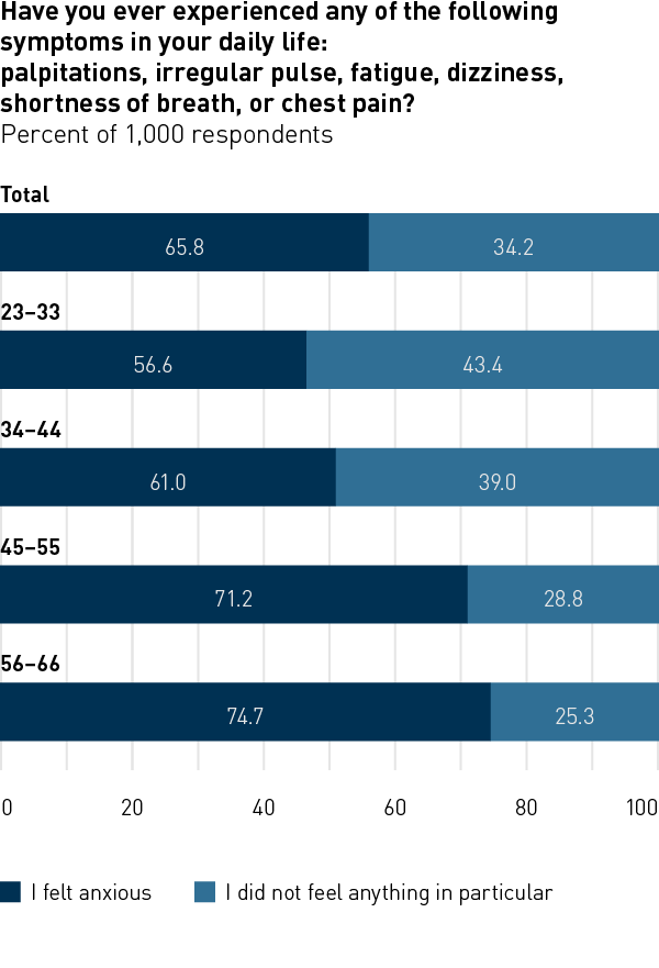A total of 84.6% of respondents reported experiencing early symptoms of AFib, such as palpitations and shortness of breath, in their daily lives. 65.8% said they felt anxious when experiencing these symptoms. By age group, the proportion of respondents who felt anxious increased with age, with more than 70% of women aged 45 and older reporting feelings of anxiety.