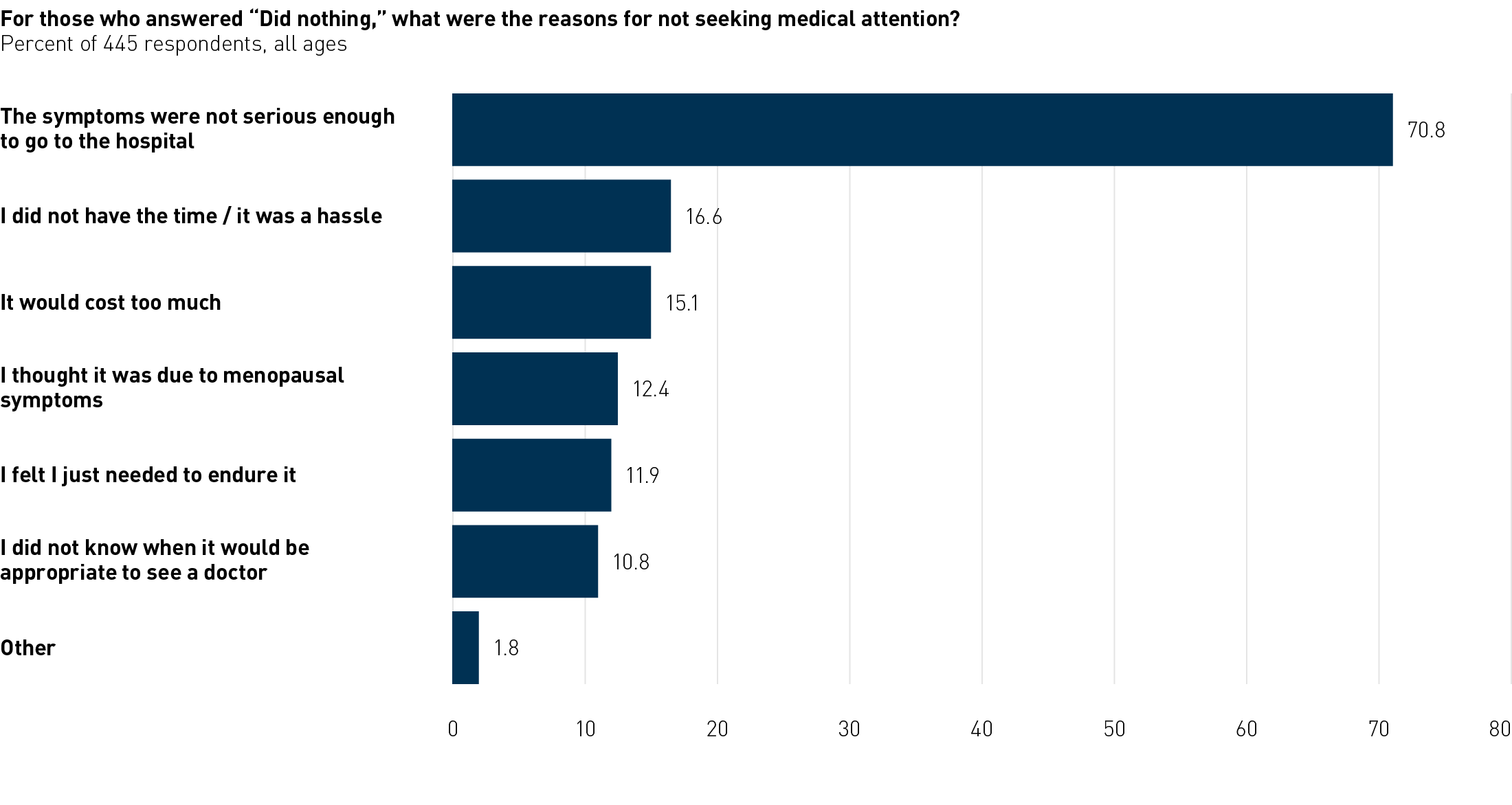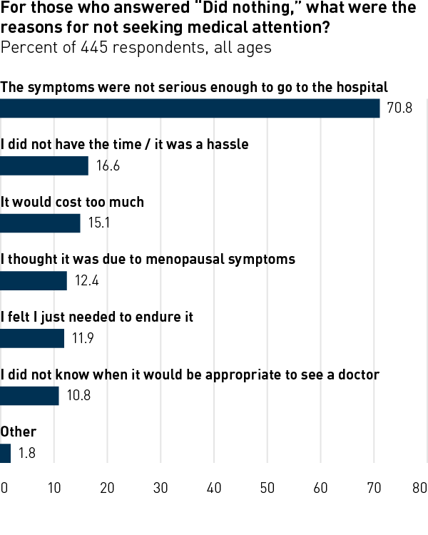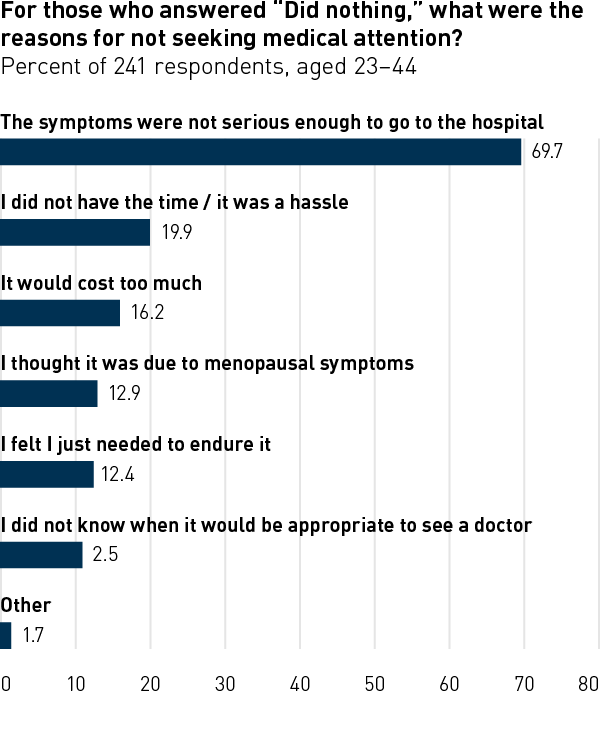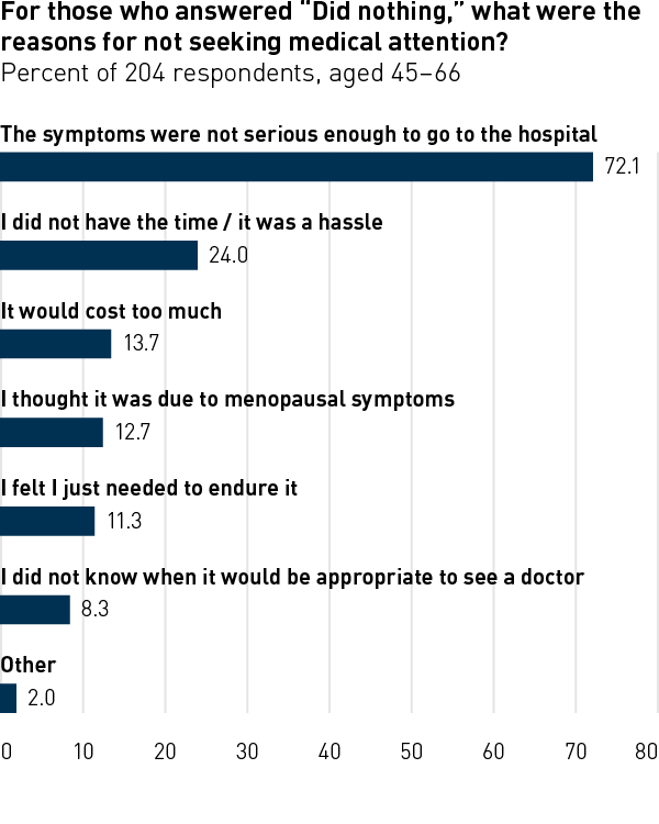The most common reason for not taking action, across all age groups, was that they did not consider the symptoms serious enough to warrant a hospital visit. The second most common reason among women aged 23–44 was lack of time or feeling it was a hassle, while for women aged 45–66 it was the belief that the symptoms were due to menopause.