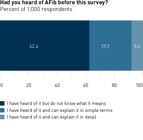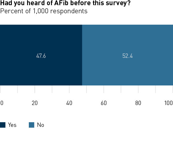 About 50% of respondents were aware of AFib. Of these, approximately 60% had only heard of it but did not understand what it meant.